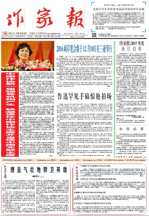 作家報最新期2016年12月2日(1)版 2016-12-15 作家報國際華文作家網(wǎng) 免責聲明:文章內容不代表華文作家網(wǎng)_作家報立場,華文作家網(wǎng)_作家報不對其內容的真實性、完整性、準確性給予任何擔保、暗示和承諾,僅供讀者參考,文章版權歸原作者所有。如本文內容影響到您的合法權益(內容、圖片等),請及時聯(lián)系華文作家網(wǎng)_作家報,我們會及時刪除處理。