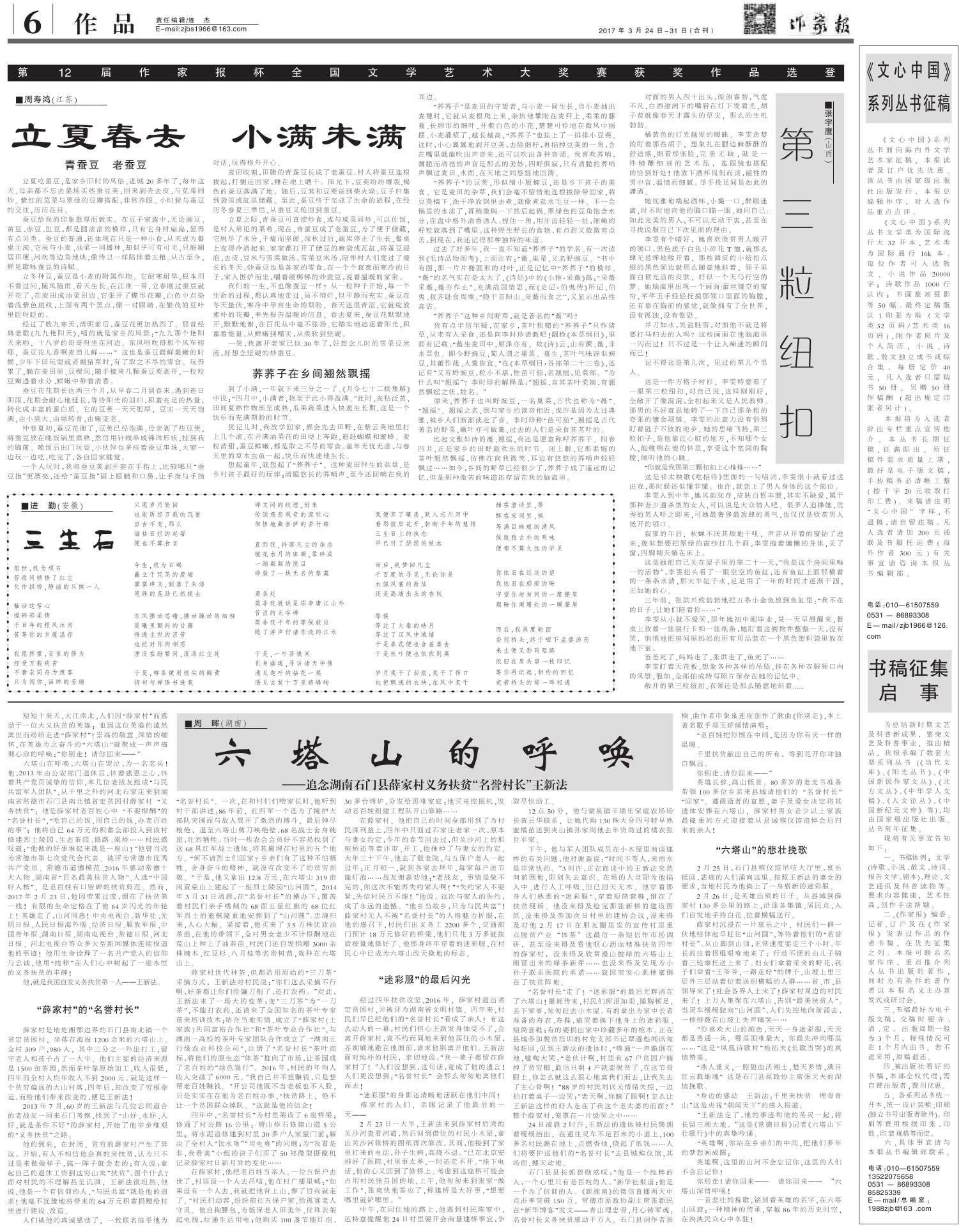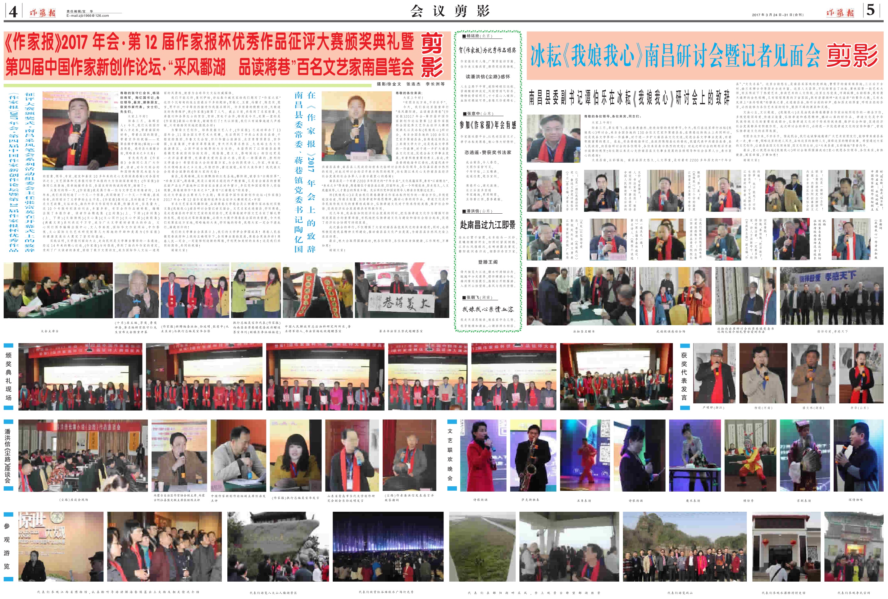 2017年3月24日-31日合刊,南昌筆會剪影專刊 2017-04-05 作家報國際華文作家網(wǎng) 核心提示:2017年3月24日-31日合刊,南昌筆會剪影專刊 免責(zé)聲明:文章內(nèi)容不代表華文作家網(wǎng)_作家報立場,華文作家網(wǎng)_作家報不對其內(nèi)容的真實性、完整性、準確性給予任何擔保、暗示和承諾,僅供讀者參考,文章版權(quán)歸原作者所有。如本文內(nèi)容影響到您的合法權(quán)益(內(nèi)容、圖片等),請及時聯(lián)系華文作家網(wǎng)_作家報,我們會及時刪除處理。