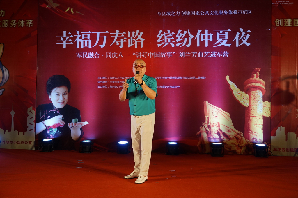 2017年是中國(guó)人民解放軍建軍90周年,7月30日晚,“軍民融合 同慶八一,講好中國(guó)故事:劉蘭芳曲藝進(jìn)軍營(yíng)”活動(dòng)在京舉行。中國(guó)文聯(lián)副主席、中國(guó)曲藝家協(xié)會(huì)名譽(yù)主席、著名評(píng)書(shū)表演藝術(shù)家劉蘭芳與眾曲藝名家一起走入萬(wàn)壽路街道,軍民共慶八一建軍節(jié),為廣大駐地官兵和社區(qū)居民獻(xiàn)上了精彩紛呈的表演。這次活動(dòng)由海淀區(qū)萬(wàn)壽路街道辦事處主辦,北京華夏漢易文化傳播有限公司、北京市海淀區(qū)作家協(xié)會(huì)承辦。
