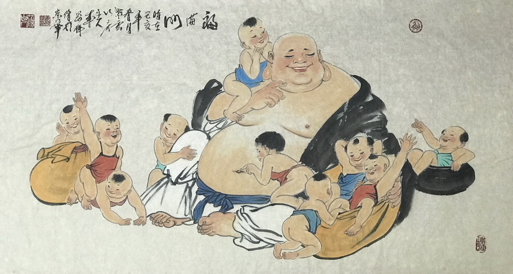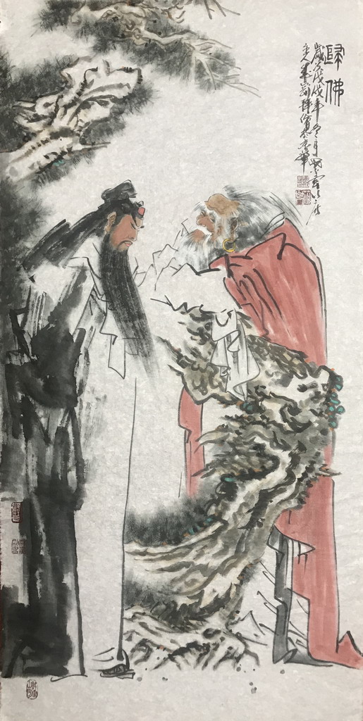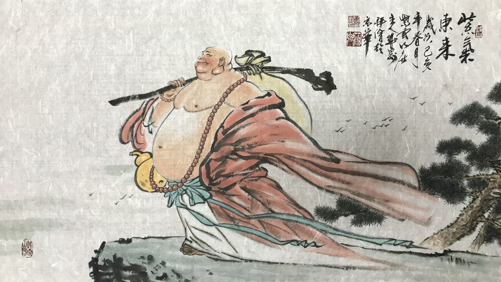 《老子出關(guān)》也是姜成剛眾多得意作品之一。畫面上的老子騎著青牛,仿佛從天而降。畫家對人物的表情、眼神、姿態(tài)和整體構(gòu)圖都很有創(chuàng)意。大肚子的《彌勒佛》更是讓人為之會心一笑,人間煩惱和憂愁全部忘掉。他是給人間帶來快樂和美好的使者,所以笑口常開,煩惱全都拋到九霄云外。《關(guān)公赤兔馬》中威武霸氣的關(guān)公,雙手揮舞著偃月刀,為天下眾生保佑平安。這些歷史和傳說中的人物,被姜成剛刻畫得栩栩如生令人震撼。