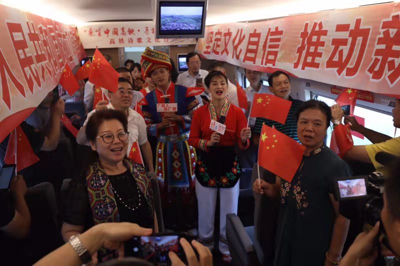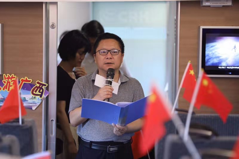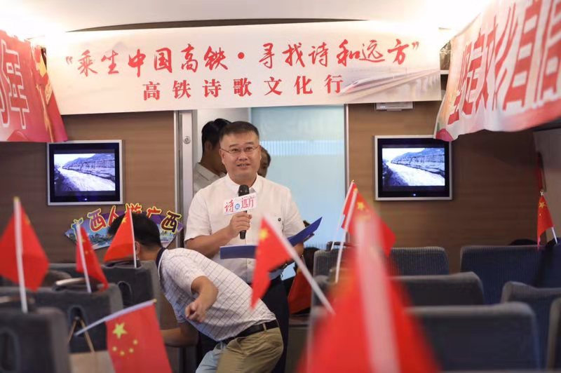 為貫徹落實(shí)習(xí)近平新時(shí)代中國(guó)特色社會(huì)主義思想和黨的十九大精神,慶祝新中國(guó)成立70周年,推動(dòng)新時(shí)代詩(shī)歌的發(fā)展。中國(guó)鐵路南寧局集團(tuán)有限公司、中國(guó)作家協(xié)會(huì)《詩(shī)刊》社、中國(guó)鐵路文學(xué)藝術(shù)工作者聯(lián)合會(huì)、廣西壯族自治區(qū)文藝界聯(lián)合會(huì)、廣西壯族自治區(qū)作家協(xié)會(huì)于2019年9月19日G1502次列車(chē)聯(lián)合主辦“乘坐中國(guó)高鐵·尋找詩(shī)和遠(yuǎn)方” 高鐵詩(shī)歌文化行活動(dòng),以詩(shī)歌朗誦的形式,傳承和推廣中國(guó)詩(shī)歌文化,展現(xiàn)近年來(lái)中國(guó)高鐵建設(shè)和鐵路事業(yè)發(fā)展取得的巨大成就。