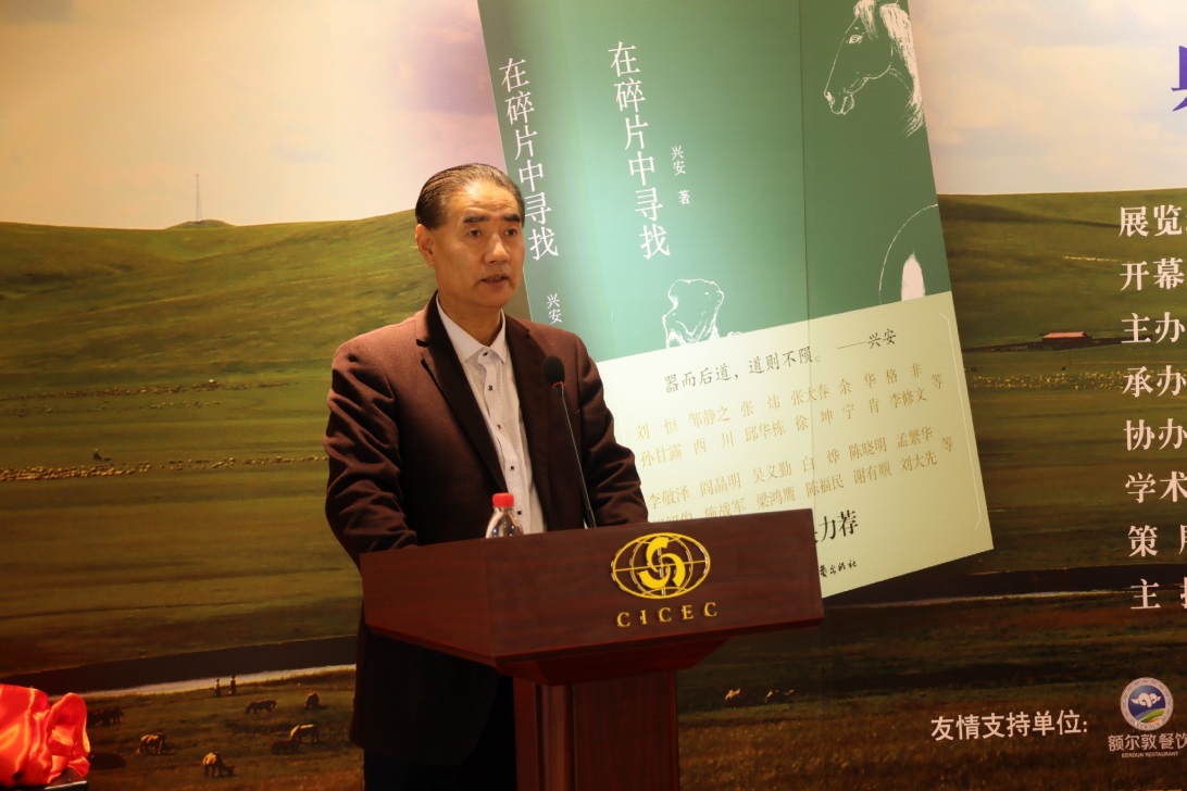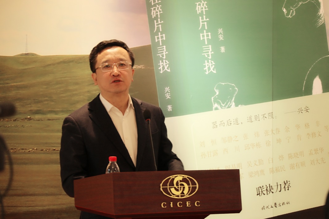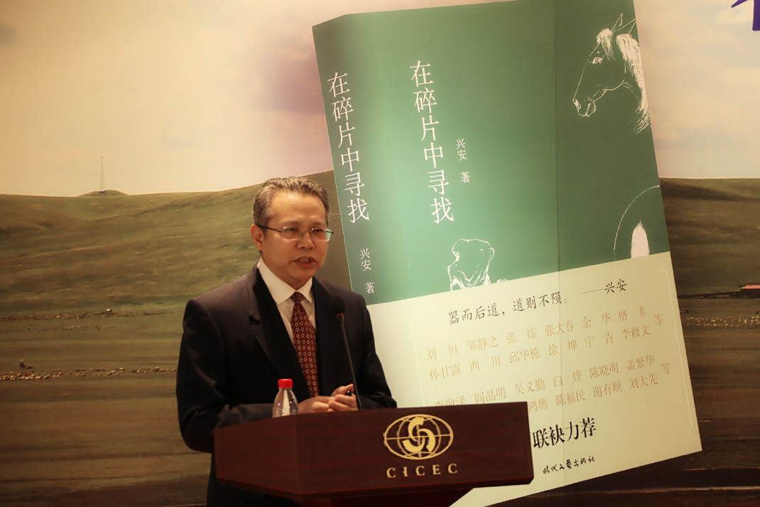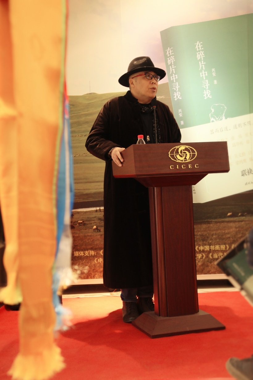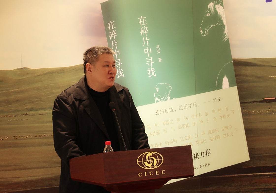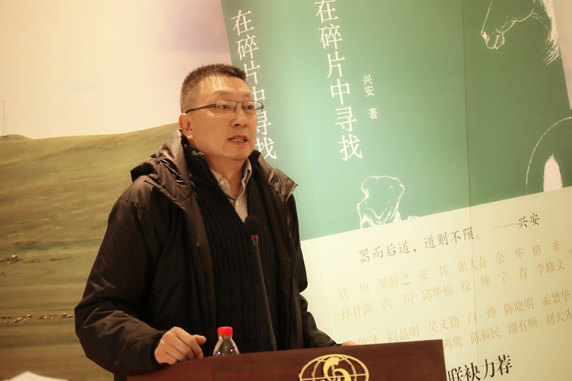 陳福民致辭:興安是我的老朋友,我和他認(rèn)識快30年了,他的《在碎片中尋找》這本書,其實(shí)僅僅是他個人才能的一小部分。興安有很著名的歷史,這個大家都知道,年輕的朋友可能不太清楚,在八十年代后期他是我們中國當(dāng)代文學(xué)期刊雜志當(dāng)中最年輕的、最著名的、最有藝術(shù)創(chuàng)造力,也最有影響力的青年主編。他關(guān)于文學(xué)、關(guān)于藝術(shù)都有很多非常獨(dú)特的想法,我們看興安這個漢子,其實(shí)他是豪爽其表、溫柔其里,他內(nèi)心里有非常柔軟的地方。喝起酒來他可能是一個天不怕、地不怕的一個豪爽的兄弟,但寫起文來,做起藝術(shù)來,他溫柔、體貼、細(xì)膩,這些所有的表現(xiàn)都在這本書里,在他的畫冊里。他對藝術(shù)的體驗(yàn),在內(nèi)在的體會當(dāng)中,對藝術(shù)經(jīng)驗(yàn)的整理和書寫,是通過他對馬,對蒙古草原的各種元素,說得神秘點(diǎn),甚至也包括血液里、基因里對自由天性的釋放,都呈現(xiàn)出來了。我衷心地希望興安未來的文學(xué)、藝術(shù)道路越來越寬廣,給我們帶來更好的作品,把那種美的、自由的東西更生動鮮活地呈現(xiàn)給我們。