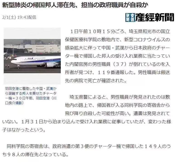 昨天晚上,刷爆朋友圈的一條新聞是——日本負(fù)責(zé)武漢撤僑的一名政府官員,因?yàn)樵跓o法阻攔兩名可能感染的國民離開而導(dǎo)致人心惶惶之后,不堪壓力,選擇跳樓自殺,并沒有留下遺書。