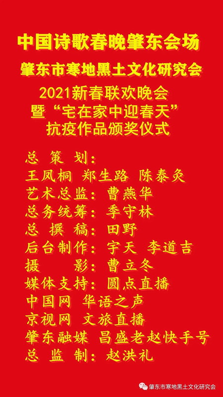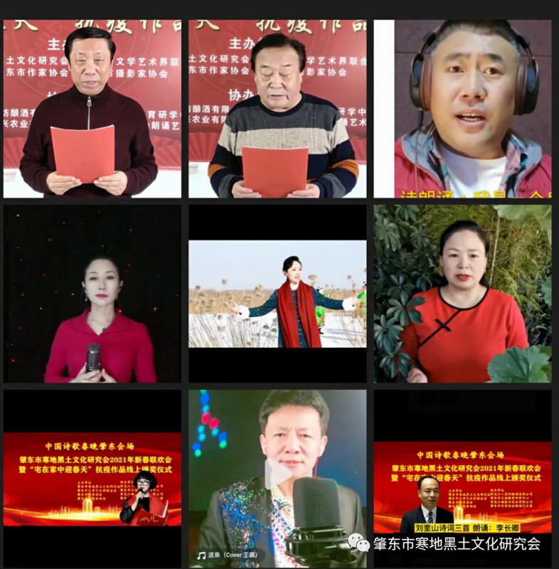 2021年2月3日晚7時(shí),中國(guó)詩(shī)歌春晚肇東會(huì)場(chǎng)、肇東市寒地黑土文化研究會(huì)2021年新春聯(lián)歡會(huì)、“宅在家中迎春天”抗疫作品線上頒獎(jiǎng)晚會(huì)在線上隆重舉行。