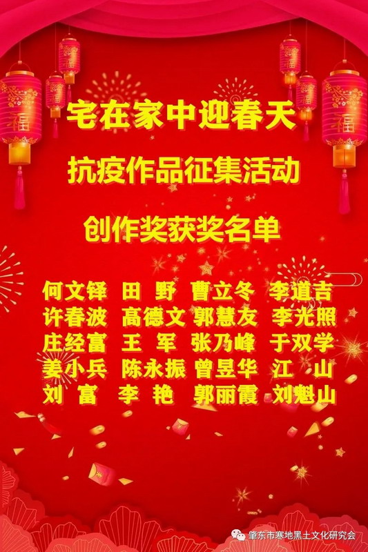 肇東市2021年1月18日起,為了防止綏化部分縣市疫情影響,對(duì)全市進(jìn)行嚴(yán)控,為進(jìn)一步發(fā)揮以“藝”抗疫作用,豐富群眾節(jié)日期間文化生活,體現(xiàn)人民群眾對(duì)政府管控的理解和支持,肇東市寒地黑土文化研究會(huì)積極響應(yīng)宣傳部門號(hào)召,廣泛組織開展網(wǎng)上文化活動(dòng)。其中,肇東市寒地黑土文化研究會(huì)聯(lián)合肇東市社科聯(lián)、肇東市文聯(lián)、肇東市作家協(xié)會(huì)、肇東市攝影家協(xié)會(huì)主辦;黑龍江八里坊釀酒有限公司 、肇東市天誼研學(xué)教育中心、黑龍江福泰興農(nóng)業(yè)有限公司 、北大荒文學(xué)社、“宅在家中迎春天”抗疫作品征集活動(dòng),贏得眾多關(guān)注,短短7天,就收到300多件作品,經(jīng)專家評(píng)選,評(píng)選出創(chuàng)作獎(jiǎng)20名,表演獎(jiǎng)10名。