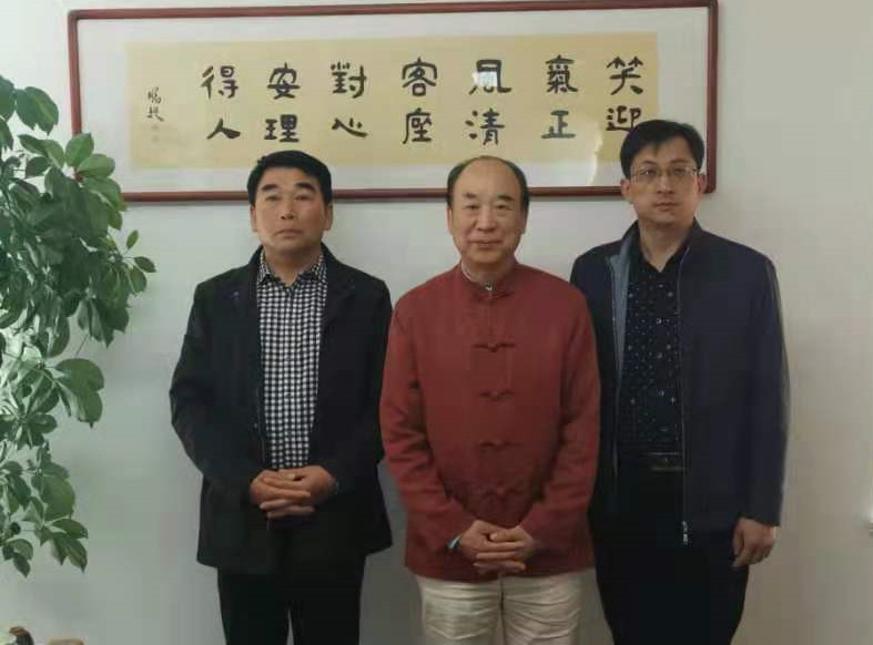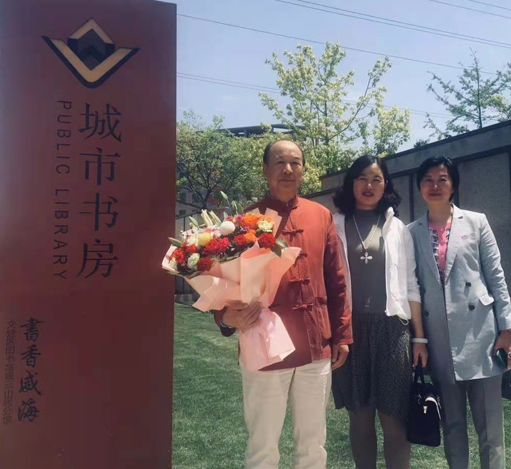 中國作協(xié)會員、亞洲微電影客座教授凌鼎年與山東威海市文登區(qū)作協(xié)主席李喜華(中),城市書房創(chuàng)始人、益本董事長妙明居士(右)合影于城市書房門口