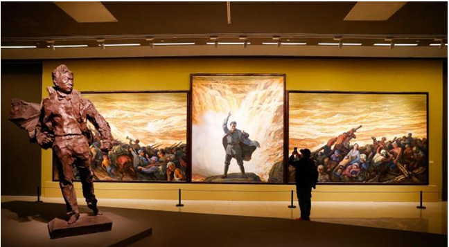吳為山說(shuō),黃河精神孕育了無(wú)數(shù)經(jīng)典作品,如抗日戰(zhàn)爭(zhēng)爆發(fā)以后,喚醒中華民族英勇抗?fàn)幎分镜摹读x勇軍進(jìn)行曲》、《黃河大合唱》;如描繪“萬(wàn)里黃河第一壩”、歌頌新中國(guó)建設(shè)事業(yè)的《黃河清》;如營(yíng)造出中華民族飽經(jīng)憂(yōu)患的深沉情感的《黃河初醒》《爺爺?shù)暮印罚蝗缦笳髦幌⒌拈_(kāi)拓精神和勇氣的《在激流中前進(jìn)》《黃河大合唱——流亡·奮起·抗?fàn)帯罚蝗缈坍?huà)冒著敵人的炮火不斷前進(jìn)、昭示中華民族巨大的精神力量雕塑作品《聶耳》……名作力作不勝枚舉。這些作品的共同特點(diǎn)是形成了一個(gè)相互呼應(yīng)的強(qiáng)大氣場(chǎng),這種呼應(yīng)飽含著民族的血脈,共同奏響了中華民族心靈深處的旋律。
