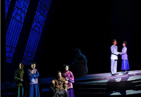 舞美設(shè)計劉鵬表示,“該劇舞美設(shè)計的起點是象征主義空間的可對話性——用象征主義的真實來完成“寫實”。用傾斜的線、低垂的浮雕構(gòu)件、透明又堅硬的碩大灰墻組合去展現(xiàn)一座深宅大院,拒絕營造“真實”的幻景來直接給到觀眾,而是將寫實置于象征主義之中,用象征主義的手法來詮釋對舞臺空間的態(tài)度。和觀眾一起,共同完成營造內(nèi)心的真實。”( 高凱)