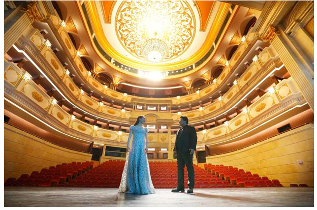 劇場(chǎng)色調(diào)以與鳳凰匹配的金黃色為主,內(nèi)部金黃色與紅色相交織的色系組合,將中國(guó)文化元素與歐洲古典建筑風(fēng)格相融合。總高6.5米、直徑4.5米的華麗精致的穹頂?shù)鯚簦由辖鸨梯x煌的四壁內(nèi)飾,置身其中極具觀賞歌劇的儀式感。