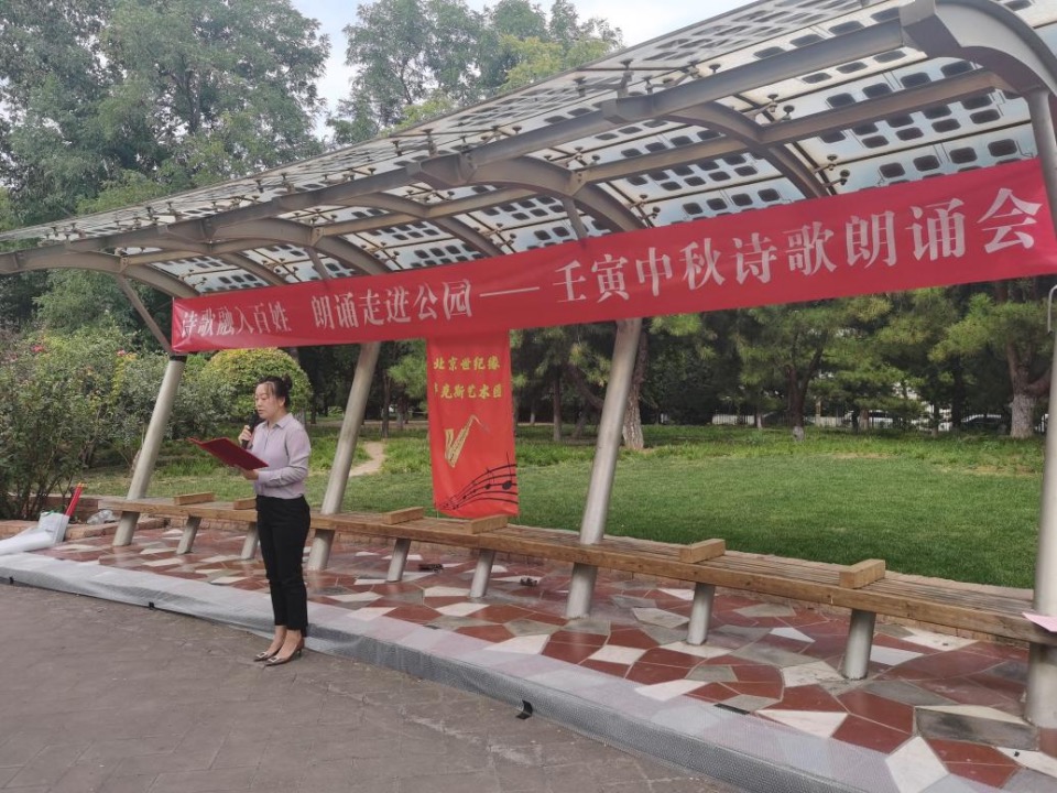 今天有幸邀請到尊貴的嘉賓和詩人,在中華世紀壇公園文化廣場舉辦“壬寅中秋詩歌朗誦會”,我謹代表主辦方:北京德藝雙馨公益基金會玉壇詩書畫苑對大家的光臨表示熱烈歡迎和衷心感謝!今年五月,我們就準備在這里舉辦一場《五一詩歌朗誦會》因疫情防控,活動未能如期進行。目前北京疫情穩(wěn)定向好,但為了防疫需要,我們嚴格按照限制人數(shù),佩戴口罩,核酸檢測等要求,選擇空曠的公園環(huán)境,參加人員以遊園的方式進行。