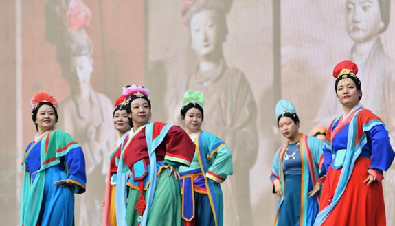 千年柏樹(shù)下,只見(jiàn)數(shù)名“歌舞侍女”,頭戴紅絲扇形包髻、身著藍(lán)襦長(zhǎng)裙、手持絹巾,從圣母殿款款走來(lái),她們翩翩起舞,婀娜多姿,吸引游客觀賞。