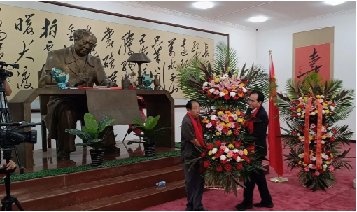 中國發(fā)明協(xié)會(huì)黨委書記余華榮和毛澤東手書館館長張朝亮與大家一起,向毛主席銅像敬獻(xiàn)花籃。