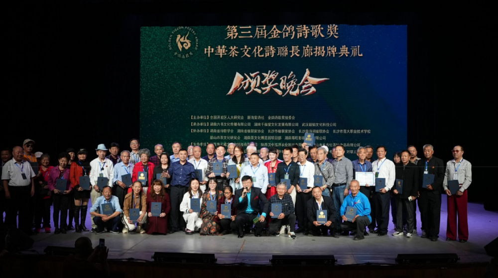 10月29日,由全國開發(fā)區(qū)人大研究會(huì)、新海棠詩社、金鴿詩歌獎(jiǎng)組委會(huì)聯(lián)合主辦的“第三屆金鴿詩歌獎(jiǎng)?lì)C獎(jiǎng)大會(huì)暨中華茶文化詩聯(lián)長廊揭牌儀式”在湖南長沙隆重舉行。金鴿詩歌獎(jiǎng)創(chuàng)辦人周擁軍、陳泰灸,中華詩詞學(xué)會(huì)顧問晨崧,中國楹聯(lián)學(xué)會(huì)顧問、湖南德泉國學(xué)書院院長余德泉,湖南文史館館員曾昭才,世界詩人大會(huì)中國辦事處主任北塔,中國楹聯(lián)學(xué)會(huì)副會(huì)長魯曉川,新海棠詩社社長姚海燕,皮劃艇世界冠軍甘瑋以及王桂林、夢天嵐、鄭鐵峰等近150位詩人出席大會(huì)。