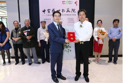 中國文化進萬家工作委員會主任、中華詩詞出版?zhèn)髅焦ぷ魑瘑T會副主任武振江為上海文化藝術(shù)中心主任姚恩滇頒發(fā)聘書,原中共中央直屬機關(guān)書畫協(xié)會副主席、中共中央編譯局書畫協(xié)會常務(wù)副主席兼秘書長張瑞祥為上海文化藝術(shù)中心副主任王健立頒發(fā)聘書。