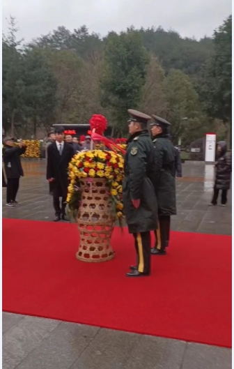 上午9點(diǎn)29分,在韶山毛澤東廣場(chǎng),伴隨著《獻(xiàn)花曲》深情的旋律,禮兵托起花籃,正步緩緩走向毛澤東同志銅像,將花籃擺放在銅像基座前。馬新存、張鄭軍緩步來(lái)到毛澤東同志銅像前,靜靜肅立。馬新存、張鄭軍緩步上前整理花籃緞帶,并向毛澤東同志銅像深深三鞠躬。隨后,馬新存,張鄭軍從左往右繞行銅像一周,深情瞻仰銅像,表達(dá)對(duì)毛主席的崇高敬意和無(wú)限追思。