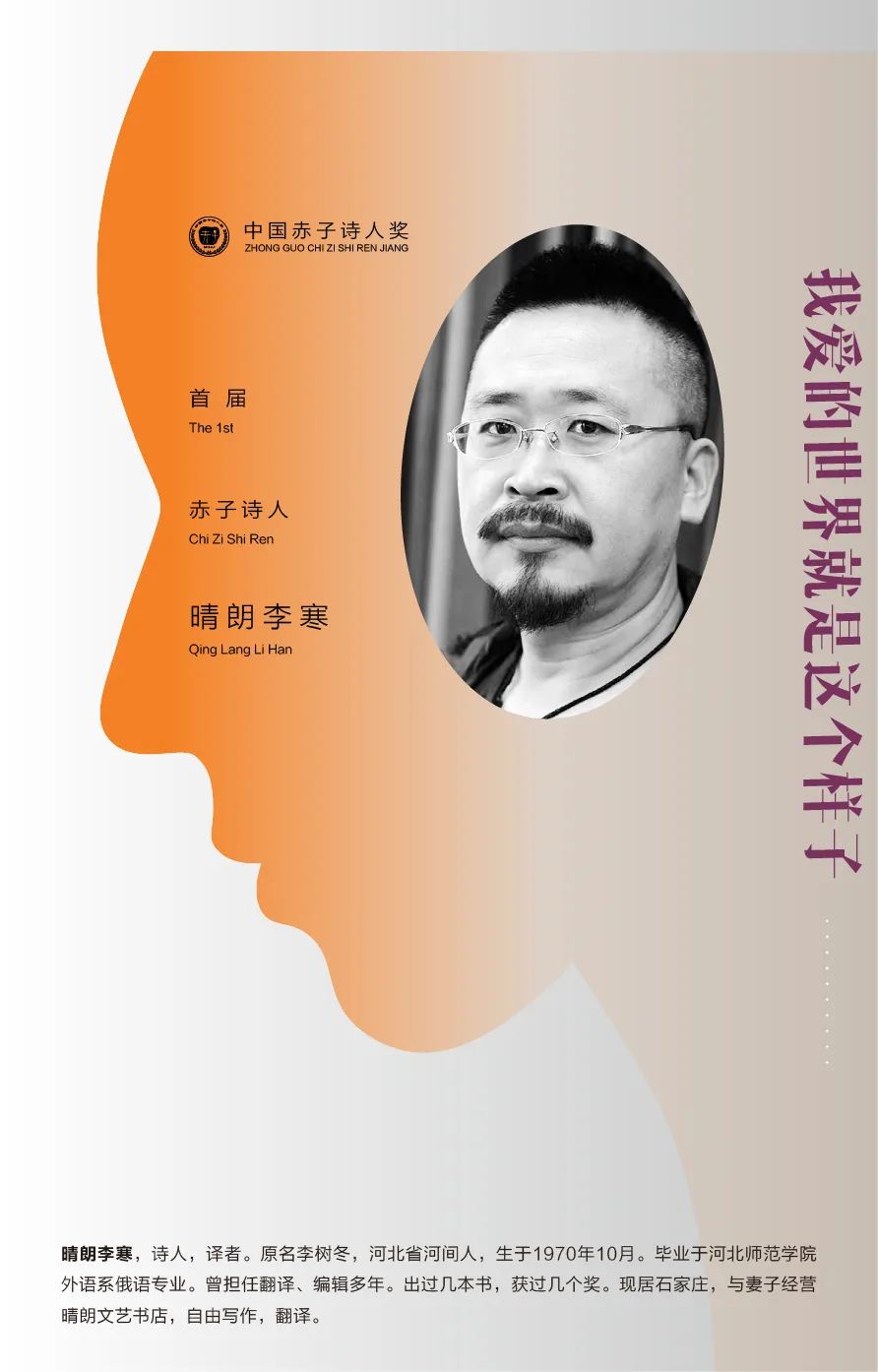 “赤子詩人獎(jiǎng)”是2013年由詩人寧延達(dá)出資并聯(lián)和多位詩友共同發(fā)起創(chuàng)辦的獨(dú)立民間詩歌獎(jiǎng),此獎(jiǎng)主要針對(duì)二十一世紀(jì)以來在當(dāng)代漢語詩歌領(lǐng)域取得突出成就的個(gè)人進(jìn)行嘉獎(jiǎng),每年六月一日舉行頒獎(jiǎng)典禮。此獎(jiǎng)甫一設(shè)立,其獨(dú)特的頒獎(jiǎng)宗旨和評(píng)選理念即得到眾多詩友廣泛支持。
