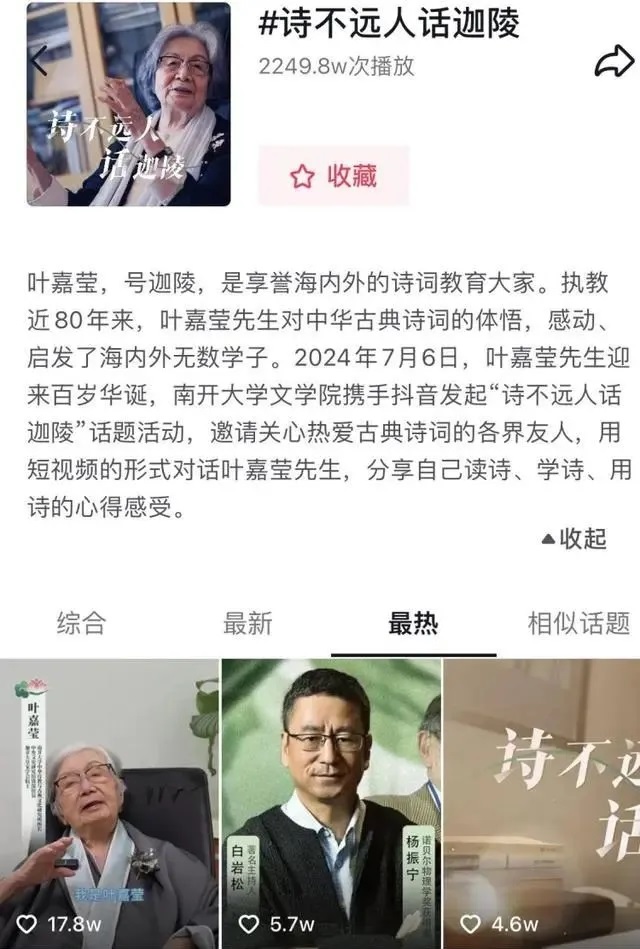把距離拉近的,是“迦陵杯·詩教中國”詩詞講解大賽(簡稱“迦陵杯”)。這項由教育部、國家語委主辦,南開大學(xué)承辦,以葉嘉瑩別號命名的賽事,面向大中小學(xué)教師、大學(xué)生、留學(xué)生與教育者敞開大門。7月6日,葉嘉瑩在百歲生日當(dāng)天宣布“學(xué)習(xí)強國”學(xué)習(xí)平臺與南開大學(xué)舉辦的“‘迦陵杯’中華詩教大會”古典詩詞講解短視頻征集活動正式啟動。