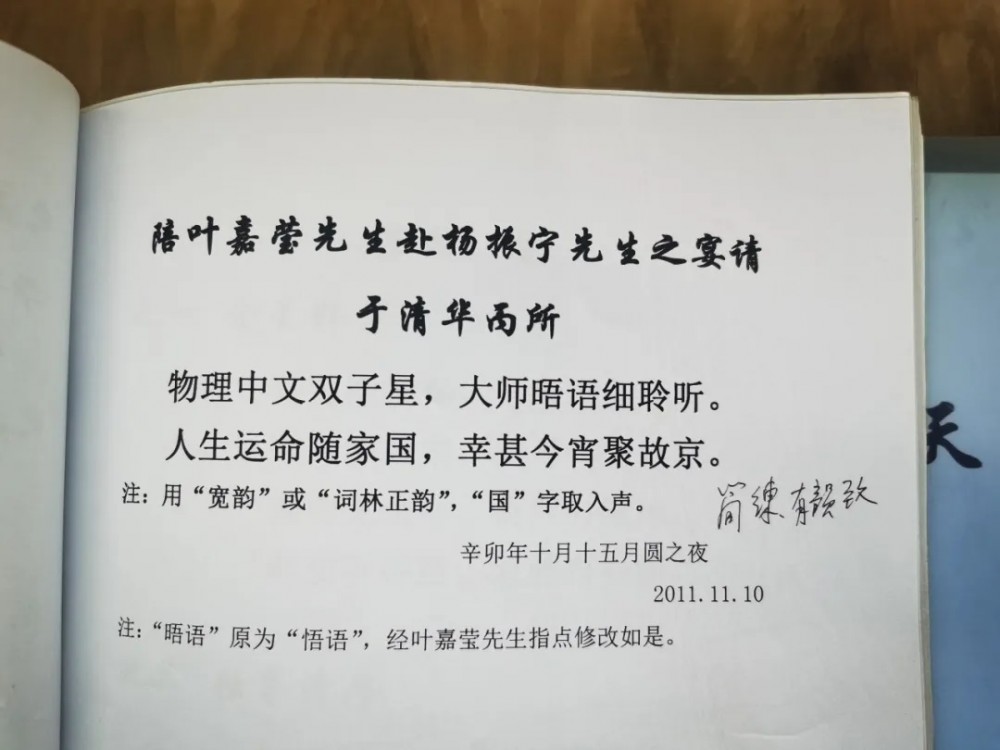 2011年11月9日,葉嘉瑩在清華大學(xué)經(jīng)管學(xué)院作講座,王玉明到了現(xiàn)場,發(fā)現(xiàn)前排聽眾還有楊振寧。“第二天,楊振寧先生邀請葉先生到清華共進晚餐,葉先生問我愿不愿意陪她一起去,我當(dāng)然愿意啊!”那天,看著科學(xué)與文化領(lǐng)域的“雙星”聚首,王玉明很有感觸,還寫了一首詩。