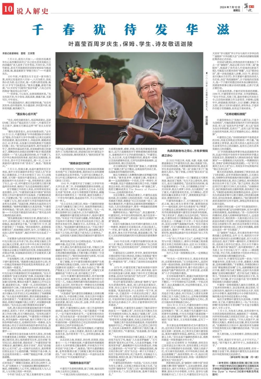 2016年,葉嘉瑩寫過這樣一首詩:“天行常健老何妨,花落為泥土亦香。感激故人相勉意,還將初曙擬微陽。”于家慧說,李商隱《燕臺》詩有“醉起微陽若初曙”之句,說醉酒醒來后意識不清,錯把夕陽當(dāng)成了朝陽。這是葉先生很清醒地“還將初曙擬微陽”,把夕陽當(dāng)成了朝陽去努力。“在協(xié)助先生審校文稿的這段日子里,先生這種‘天行健,君子以自強不息’的可貴修養(yǎng)帶給我極大的感動與鼓勵。”