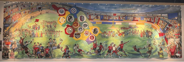 其二,是江蘇城市精神與文體精神的集中彰顯。畫(huà)作中 13 支球隊(duì)的隊(duì)標(biāo)與江蘇省地圖呼應(yīng),展現(xiàn)了江蘇 “十三市聯(lián)動(dòng)” 的文體格局;泰州 11 號(hào)的倒掛金鉤、鎮(zhèn)江 47 號(hào)的英勇?lián)跚?,刻?huà)的是 “拼搏不服輸” 的文體精神;米盧觀賽、球迷助威的場(chǎng)景,則傳遞出江蘇對(duì)足球運(yùn)動(dòng)的熱愛(ài)與包容。這些元素共同勾勒出江蘇 “崇文尚武” 的城市氣質(zhì),讓畫(huà)作成為展現(xiàn)江蘇地域文化的 “視覺(jué)名片”。