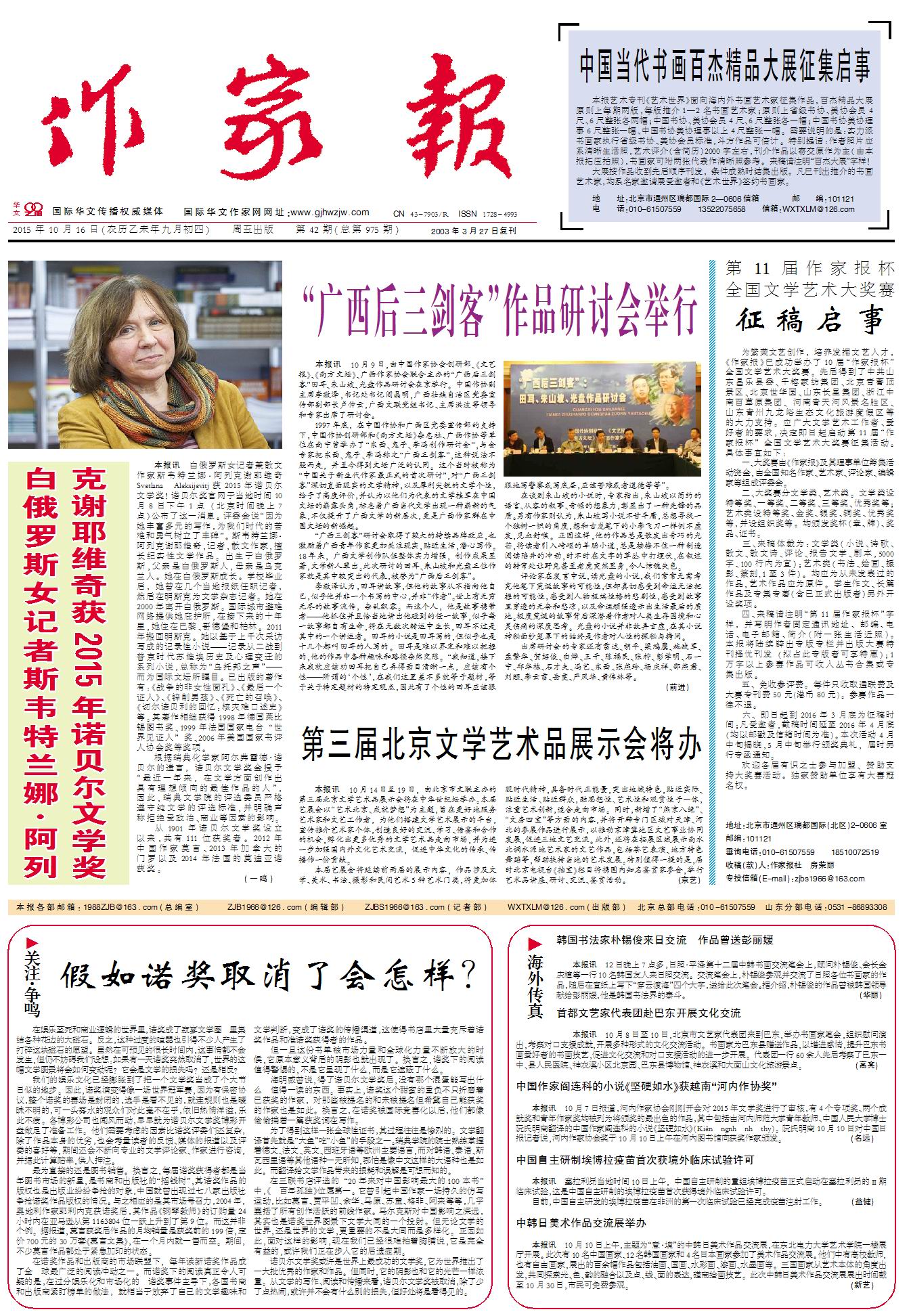 10月16日 《作家報》出版,訂閱季開始,歡迎訂閱、合作! 2015-10-16 未知國際華文作家網(wǎng) 免責聲明:文章內(nèi)容不代表華文作家網(wǎng)_作家報立場,華文作家網(wǎng)_作家報不對其內(nèi)容的真實性、完整性、準確性給予任何擔保、暗示和承諾,僅供讀者參考,文章版權歸原作者所有。如本文內(nèi)容影響到您的合法權益(內(nèi)容、圖片等),請及時聯(lián)系華文作家網(wǎng)_作家報,我們會及時刪除處理。